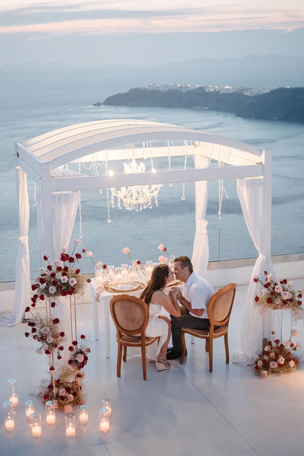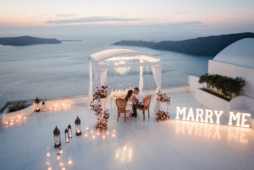 Surprise your loved one with a marriage proposal in romantic Santorini. Champagne and a candlelit dinner as the sun sets on this beautiful island is the perfect way to say "I Love You". So, how about taking the high road and proposing on a rooftop in complete privacy with a view of the most breathtaking sunset in the world, in Santorini?