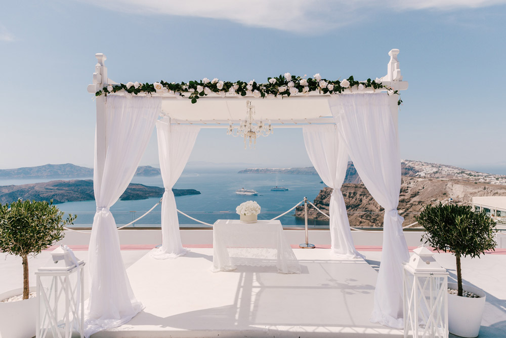 Santorini Gem can be found in Pyrgos. A private estate set in gardens with tall date trees, the view is stunning - the perfect backdrop to your very special moment. The Wedding Terrace looks out over the Caldera and Volcano, across the island and all the way to Oia.